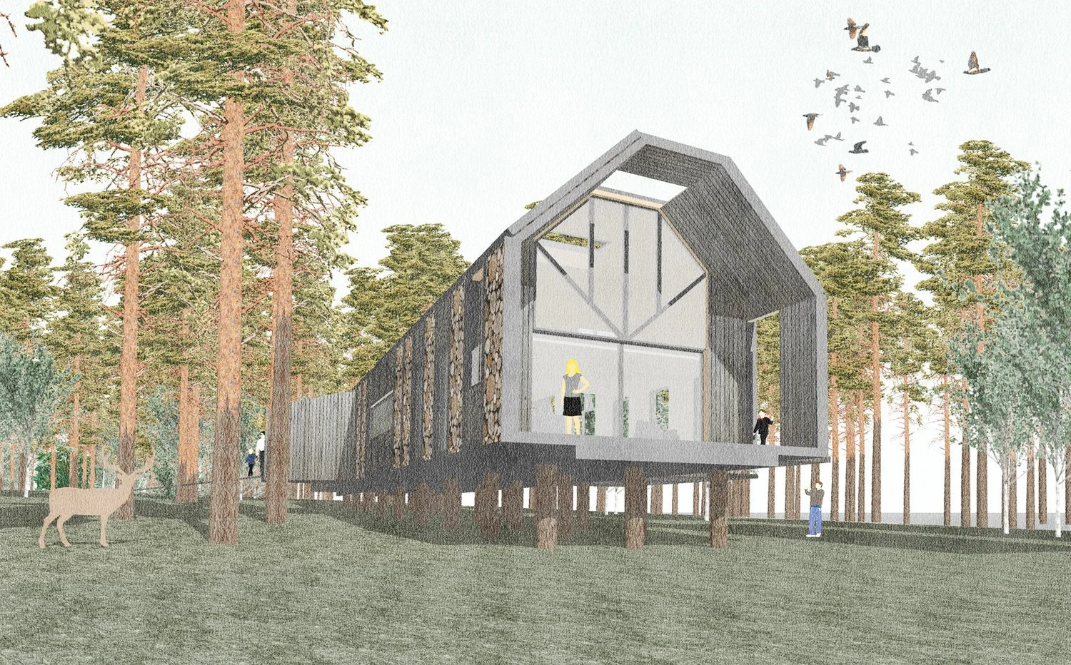 Our proposal is minimises the removal of trees from the site, and is elevated from the ground to enable the under-storey of the woodland to flow freely underneath the house. It will be built using an innovative pre-fabricated panel system made from recycled materials, and clad with logs, timber, and greenery; which will all provide additional habitat to enhance it.