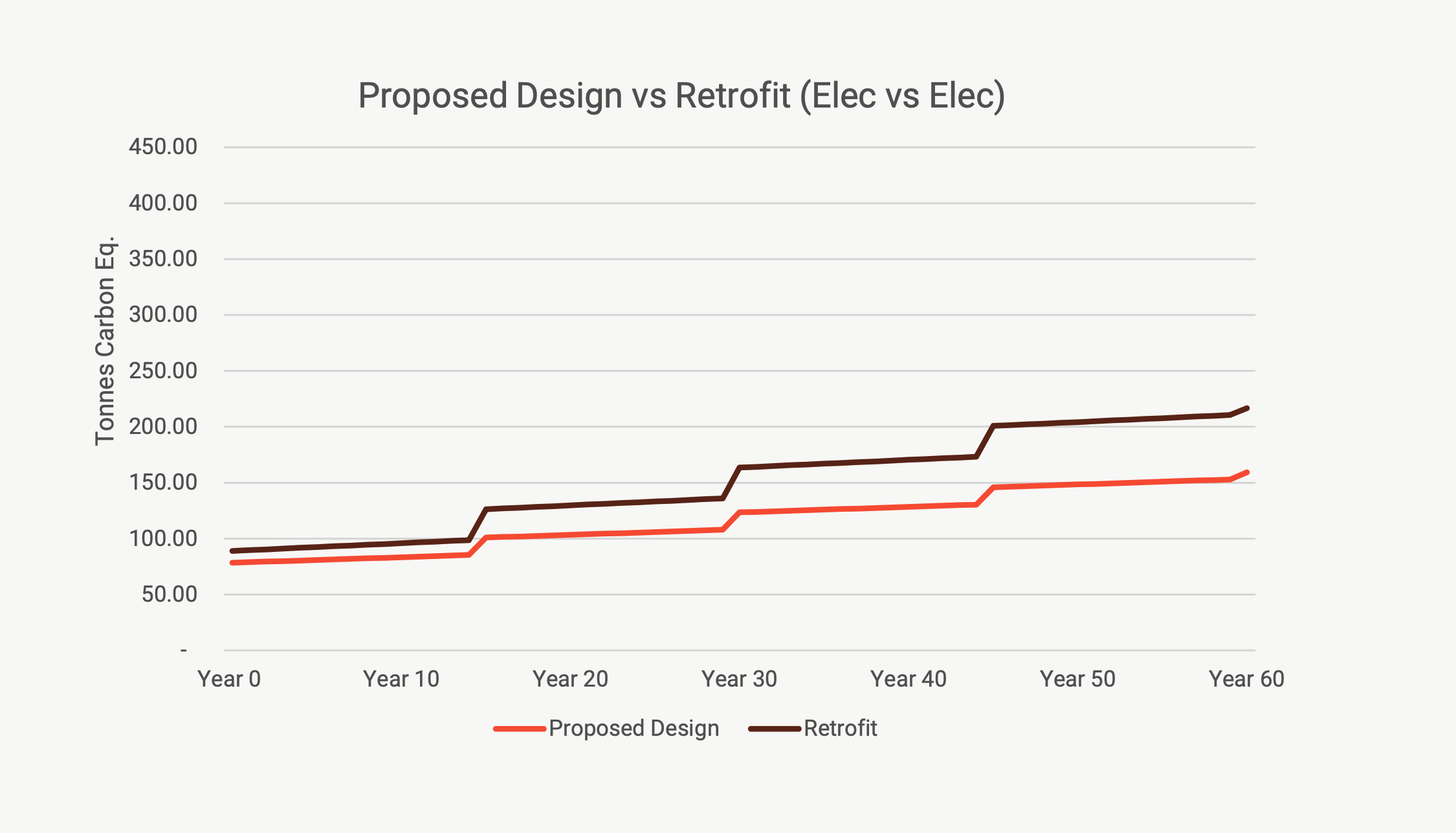 For both options - proposed design versus retrofit (gas) and retrofit (electric), the retrofit was more carbon-intensive in Year 0 than the proposed design. The low-carbon performance of the proposed design is driven using natural materials in the PH15 system, compared to the more typical construction materials used in the retrofit and extension.