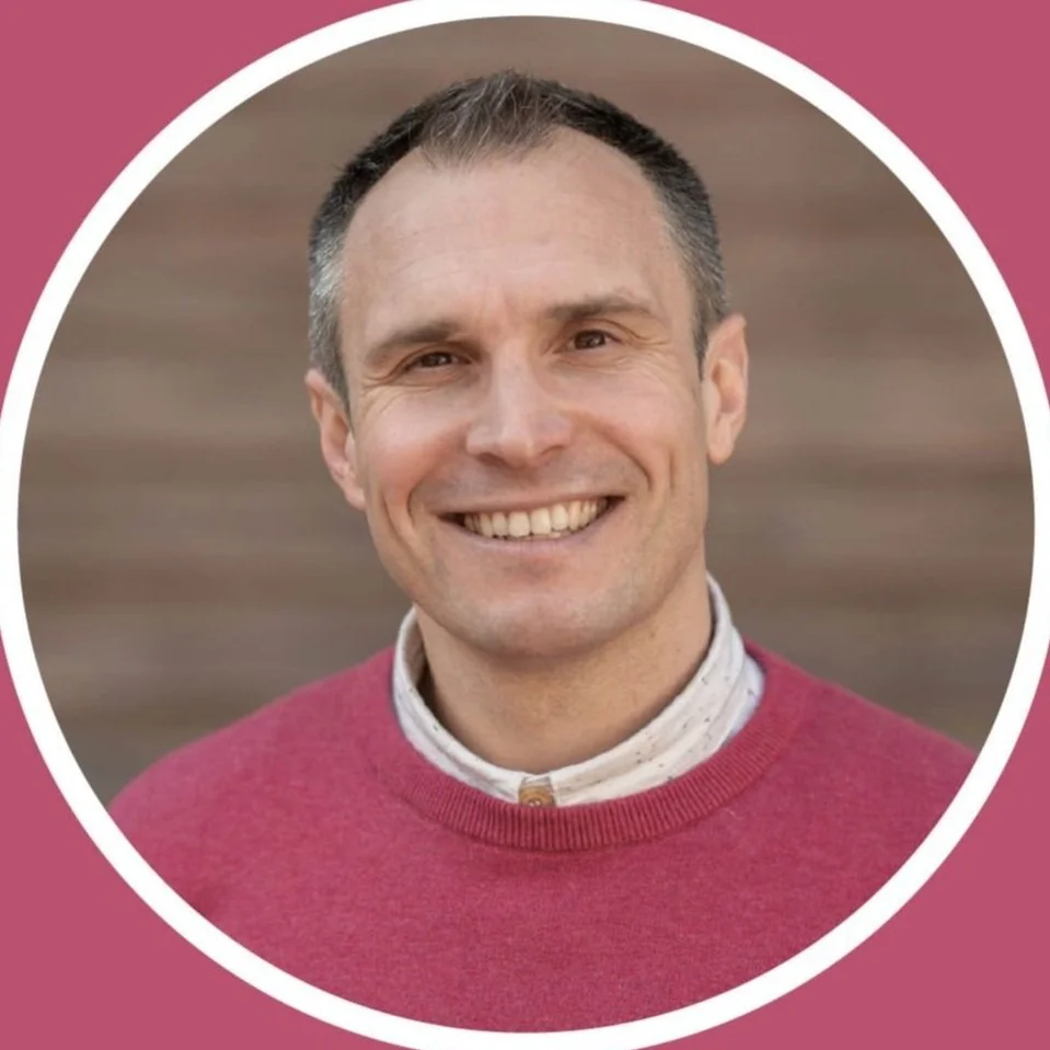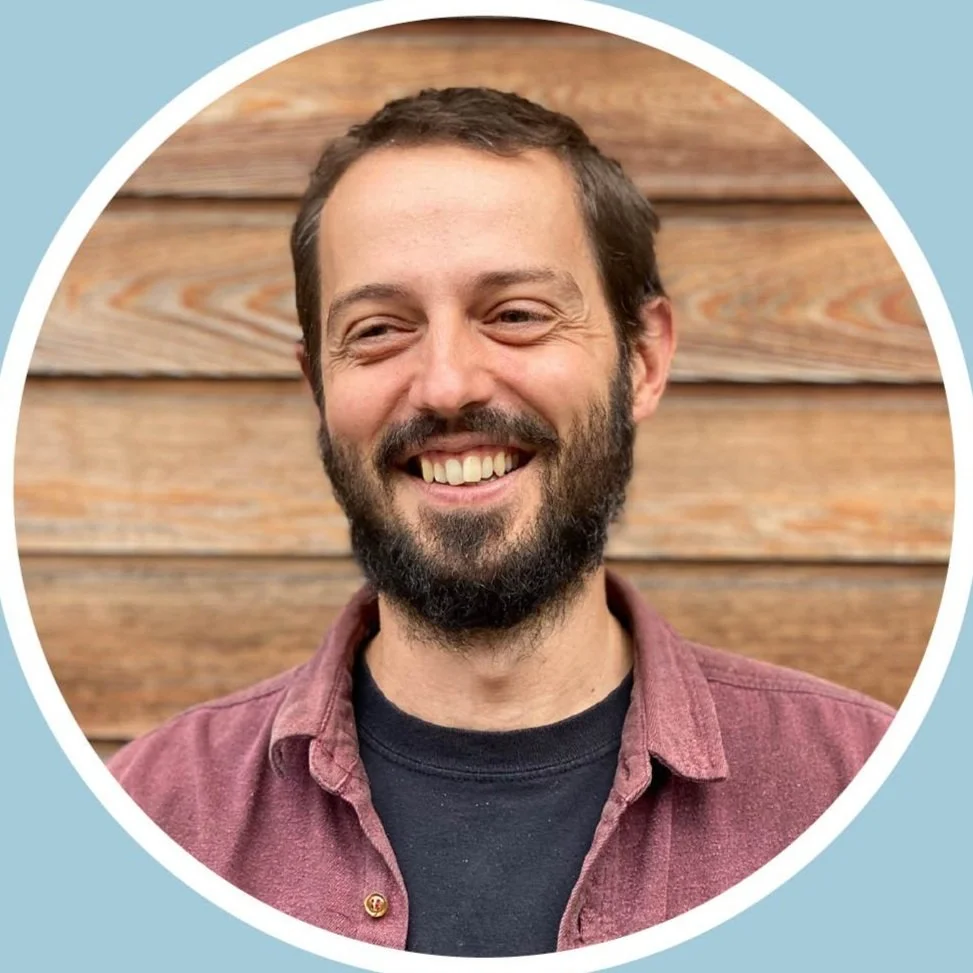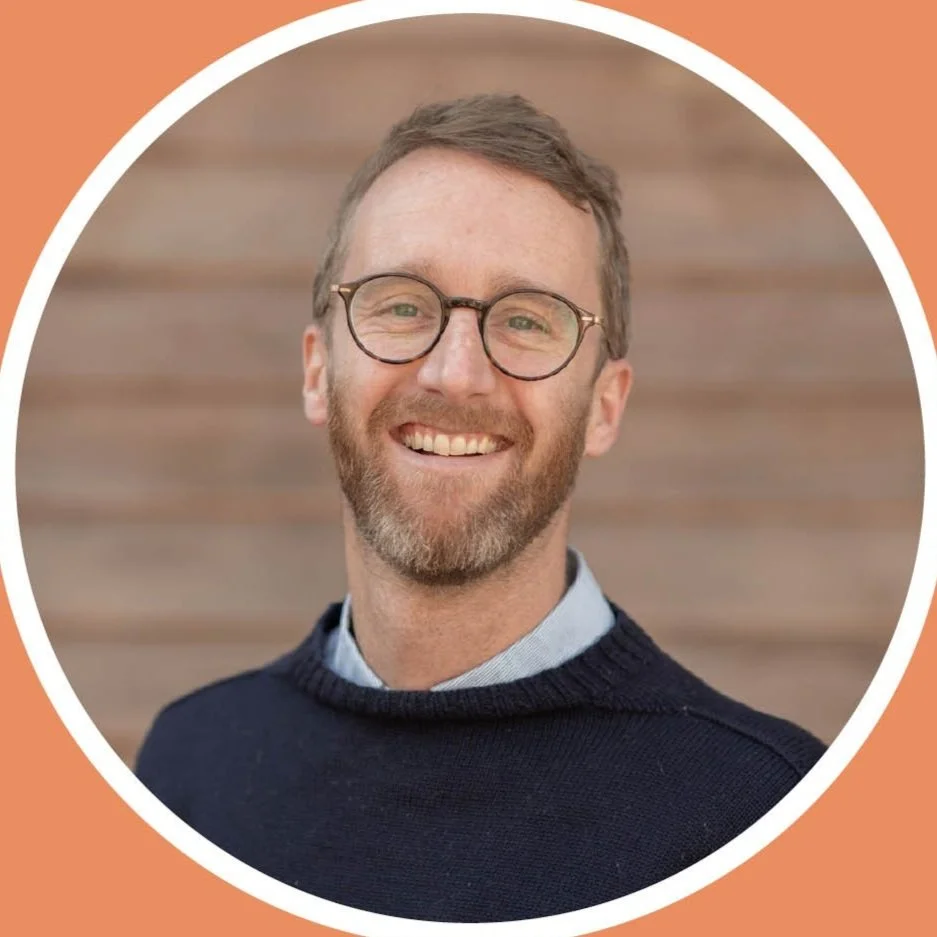 Headshot of a smiling man with glasses and a beard, wearing a dark sweater over a collared shirt, in front of a wooden background, framed in a circular border with an orange background.