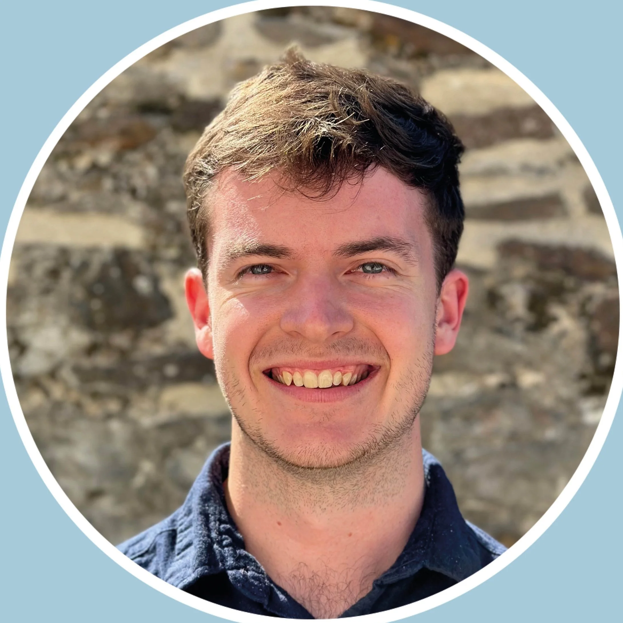 A young man smiling outdoors in front of a stone wall, with short brown hair and blue eyes, wearing a dark shirt.