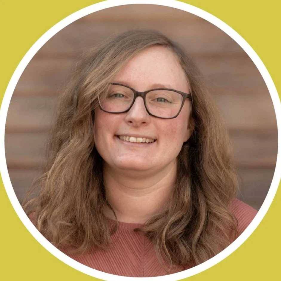 A smiling woman with long wavy hair, wearing glasses and a reddish top, standing outdoors with a blurred wooden background.