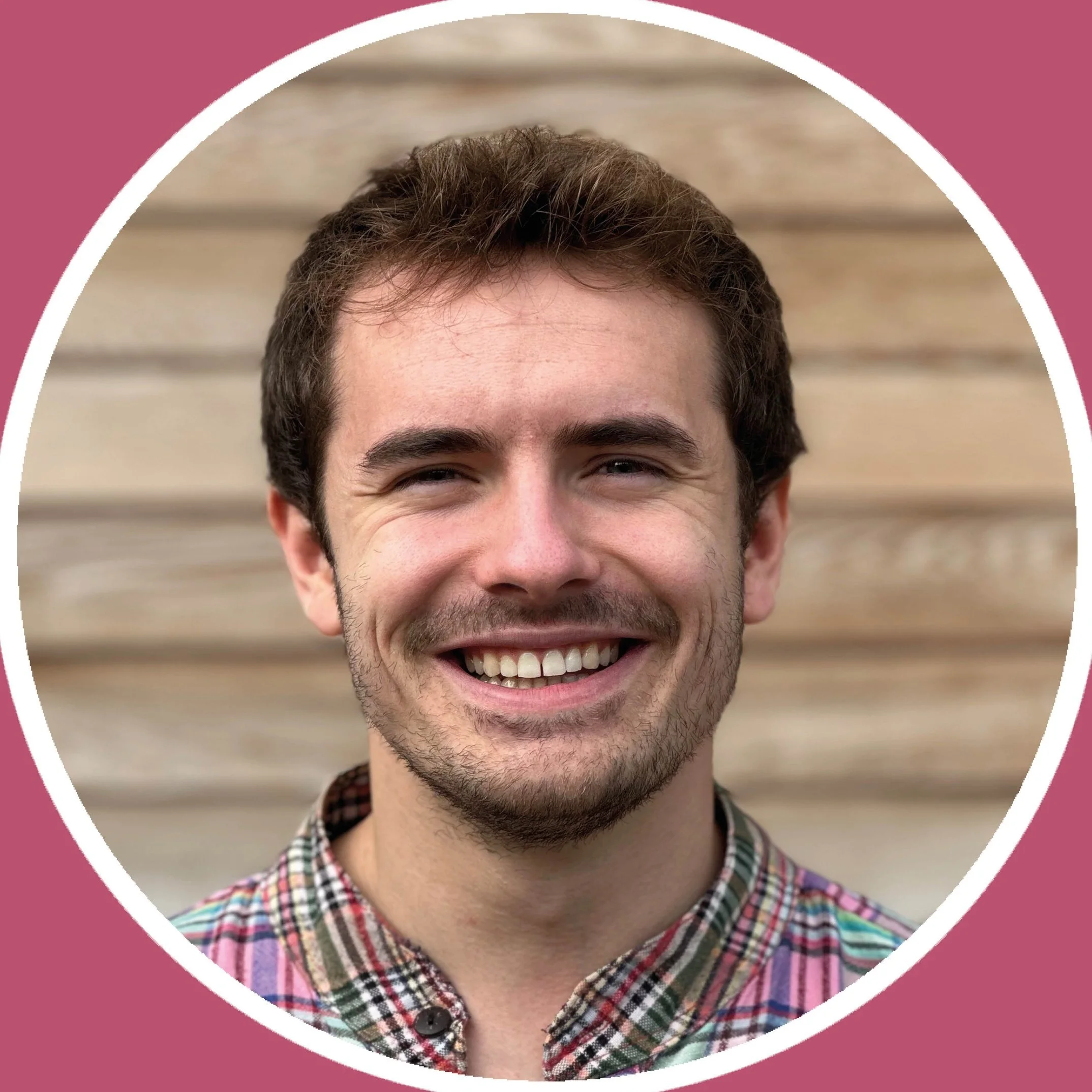 A smiling young man with brown hair, a slight beard, wearing a colorful plaid shirt, standing in front of a wooden background.