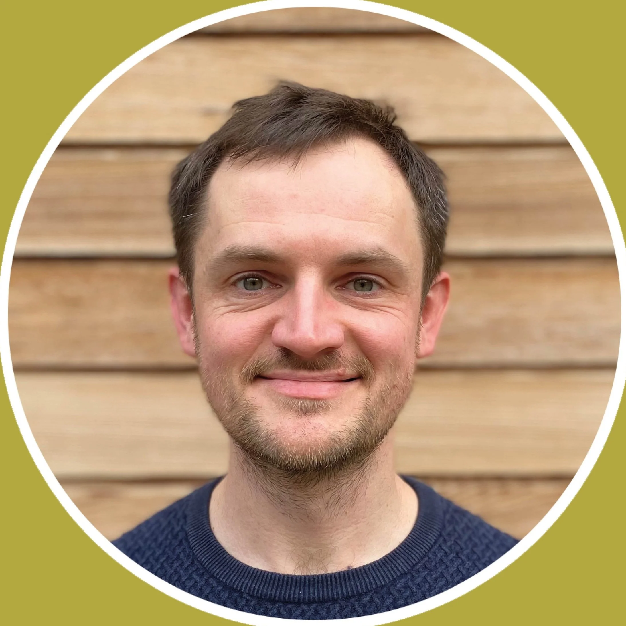 A smiling man with short brown hair, blue eyes, and a beard, wearing a navy blue sweater, standing in front of a wooden wall.